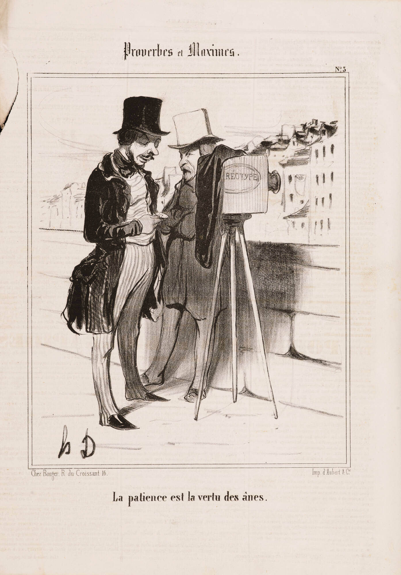 DescriptionIllustration published in Le Charivari of two men wearing top hats standing beside a camera labeled "Daguerreotype". The camera rests on a tripod and looks out over a city. The man on the left holds a pocket watch in his hand while the man on the right stands with his arms crossed and a his brow furrowed.ProvenanceGérard Lévy (1934-2016), Paris, France;