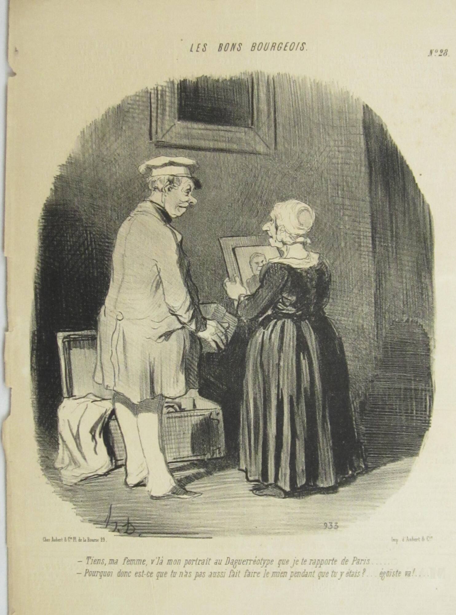 Captioned on sheet recto, bottom, in black ink: "- Tiens, ma femme, v'lá mon portrait au Daguerréotype que je te rapporte de Paris ..... / - Pourquoi donc est-ce que tu n'as pas aussi fait faire le mien pendant que tu y étais? ...égoiste va!...." [Translation: Here, my wife, is my daguerreotype portrait which I brought back for you from Paris... - Why didn't you have mine done while you were there...get lost, you egotist!]