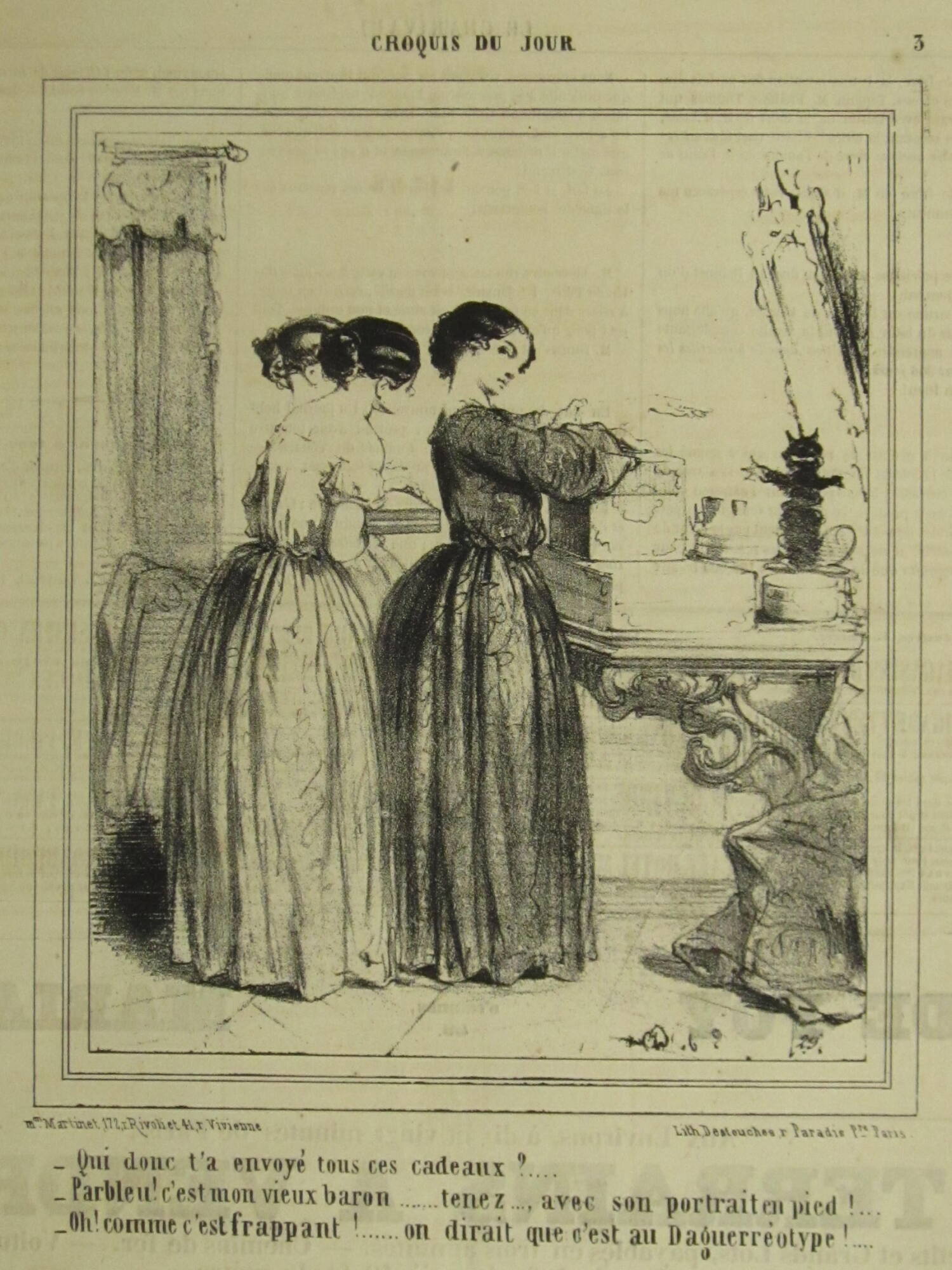 Caption on sheet recto, bottom, in black ink: "_Qui donc t'a envoyé tous ces cadeaus ? ... / _Parbleu! c'est mon vieux baron....tenez...,avec son portrait en pied. / _Oh! comme c'est frappant!....on dirait que c'est un Daguerréotype!...." [Translation: Who has sent you all these presents? / It is my old baron...wait...with his portrait. / Oh! As it is striking...it looks like it is a daguerreotype!"
