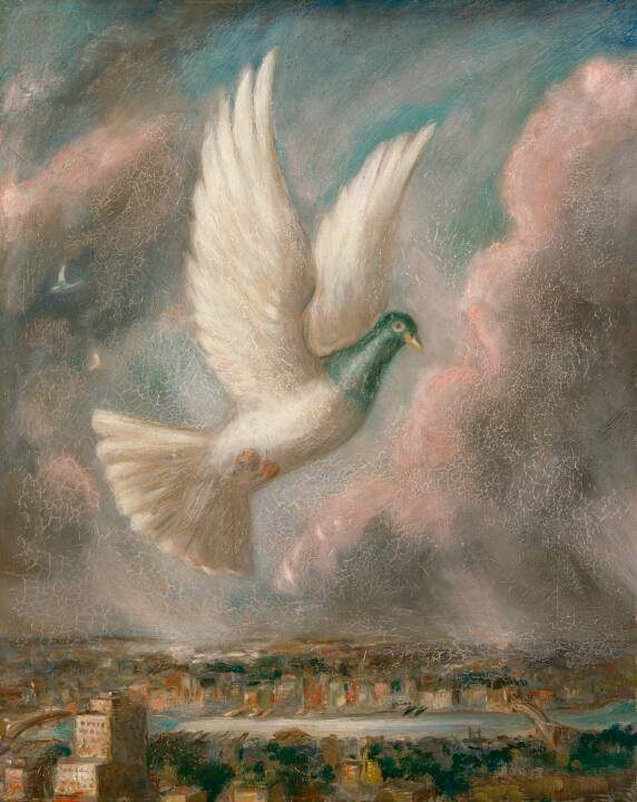 DescriptionThe painting is a close-up view of a pigeon--with a white body and blue-green head--in flight over a distant urban landscape. The freely painted view, which consists of a river traversed by two bridges and flanked by tall buildings, is confined to the bottom fifth of the canvas and is dominated by rusty reds, teal and ochre. Near the top of the canvas, the sky is blue and streaking rain descends upon the city at the lower right.Published ReferencesPatricia Junker et al., John Steuart Curry: Inventing the Middle
