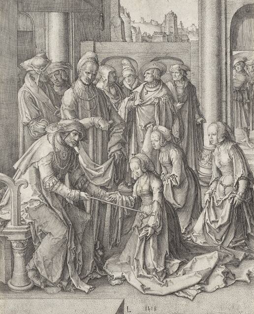 The famous silvery tones of Lucas van Leyden's engravings are exemplified in this scene taken from the Old Testament Book of Esther (8:1-8). Seated at the left is King Ahasuerus (Xerxes I) of Persia (486-465 B.C.E.) who had been persuaded to decree that all Jews in his Empire be killed. Unknown to him, his beautiful, beloved wife Esther (Hadassah) was Jewish. Here, Esther courageously kneels before Ahasuerus, who touches her with his staff to indicate that she may speak. Esther subsequently pleads for her own clemency and that of her people, and the King's tender gesture of taking her hand in his foretells his decision to grant her plea. This deliverance is celebrated each year as the Jewish Feast of Purim, and a century after this print was created, it came to symbolize the call for liberation from Spain by the Dutch, who identified themselves with the persecuted people of Israel.