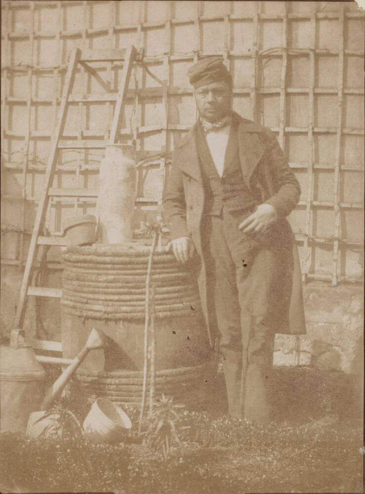 DescriptionImage of a man standing with arm resting on a large barrel, which is surrounded by pots and a watering can. He wears a suit with bow tie, vest, knee-lengh jacket and a small hat. Behind him is a ladder leaning against a trellis.Exhibition HistoryRotation 26. The Nelson-Atkins Museum of Art, Kansas City, MO, March 29, 2019- August 25, 2019, no cat.