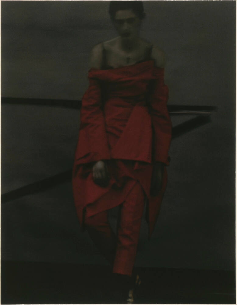 DescriptionDark image of woman wearing long off-the-shoulder red garment with coordinating pants. She has short dark hair and her facial features are mostly obscured in the shadows. In the background are two dark lines which intersect behind her.ProvenancePurchased from Howard Greenberg Gallery, New York, NY by The Hall Family Foundation, Kansas City, MO, 2018;