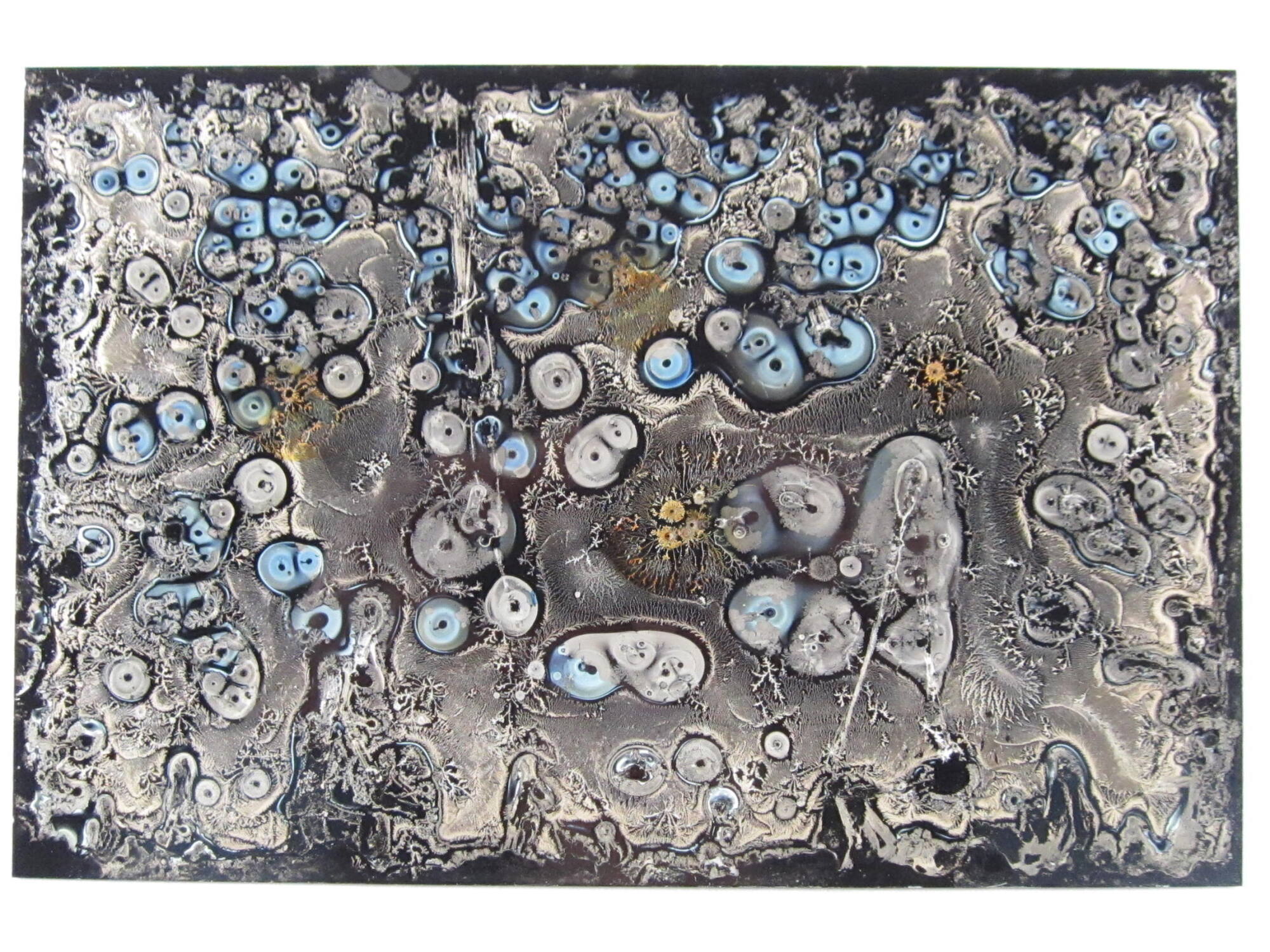 DescriptionImage of numerous asymmetrical orbs with dark centers surrounded by masses resembling dendritic ice crystals. This is a metal plate with photographic collodion coating which creates a unique microscopic topography.ProvenanceThe Hall Family Foundation, Kansas City, MO, 2018;