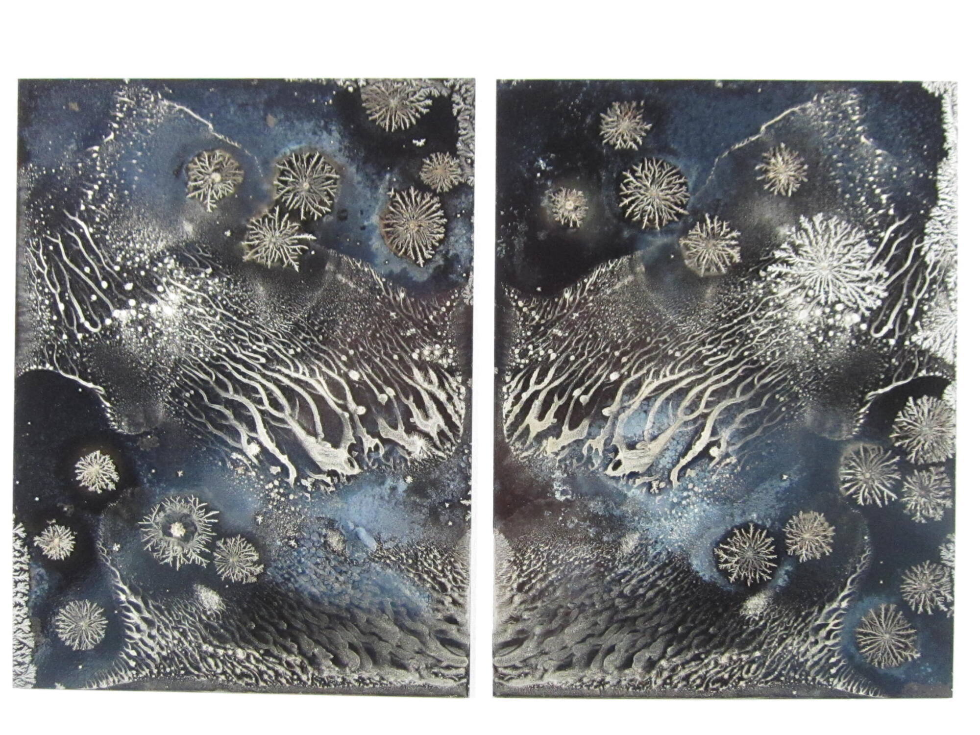 DescriptionDiptych image of small objects resembling dendritic ice crystals scattered along the perimeter; small dendritic forms with long tails appear to be traveling towards the center.ProvenanceThe Hall Family Foundation, Kansas City, MO, 2018;