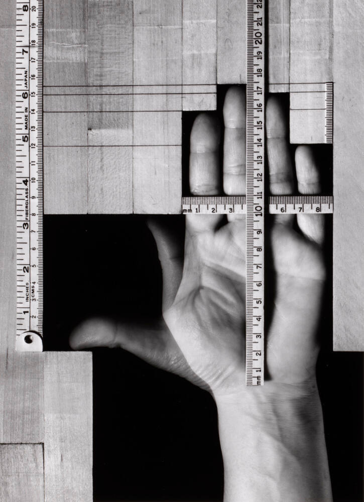 DescriptionVertically oriented image of a left hand - appears to be a double exposure with thumb extending out in one captured image. The hand is placed palm up with the fingers nestled between strips of wood; intersecting rulers measure the length and width.Exhibition HistoryRotation 26. The Nelson-Atkins Museum of Art, Kansas City, MO, March 29, 2019- August 25, 2019, no cat.