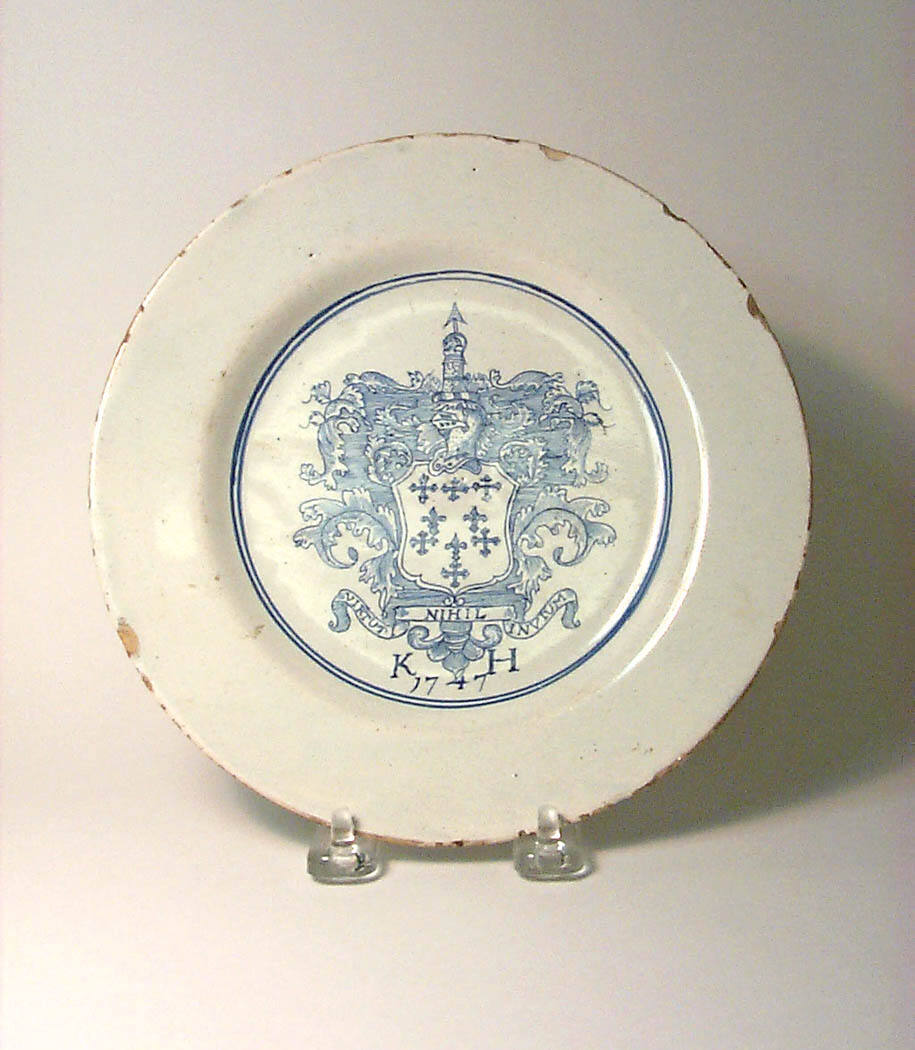 DescriptionCentral scene depicts Justice holding a sword and scales, trampling a chained man. The man holds a torch in one hand, a piece of paper on which "The Petitions" is written. Scene is framed by 2 columns supporting an arch stating "LIBERATAS-POPULI". 2 putti blowing trumpets above the arch. At bottom center of the entire image is the verse "Let Justice in Each/Honest Heart abide/And over Envey/Let Her always Ride". Decoration is executed in cobalt blue.