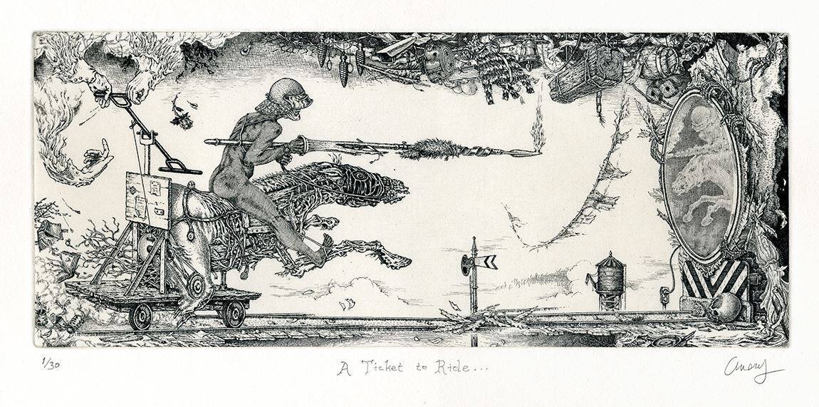 DescriptionThis horizontal, black and white print features a mostly nude human figure, likely male, holding a jousting lance and riding a horse-shaped attachment constructed on a simple railroad handcar, positioned left of center on a railroad track, moving toward the right. The horse is a ghastly combination of mechanical and fleshy parts. It’s missing its back legs below the knee and is attached to the handcar at that knee and around its buttocks. Its torso, front legs, neck, and head are cantilevered over the front of the handcar. The figure holding the reins wears only a helmet with a visor, a watch, and thin straps forming an X on his back. The shaft of his lance is partially splintered, partially covered with fur, and corkscrew-shaped right behind the head of the lance, which seems to be aflame. Horse and rider are reflected in an oval mirror held by skeletal hands above a chevron-striped half-wall that marks the end of the track. A skull lies at the wall’s base. Leaves and/or feathers are placed beside the hands holding the mirror. A water tank stands isolated in the background behind the railroad tracks, clouds behind it. An assortment of seemingly-random objects are suspended by cables and ropes from the top edge of the picture plane between the mirror and the rider. Disembodied hands reach down from the upper left corner to work the crank of the handcar. A rose falls from the sky between the crank and the rider. Cans are strung along behind the handcar, books fly into the air in its wake, and the wood of the rail tracks seems to wreck as the car rolls over it.Exhibition HistoryNone