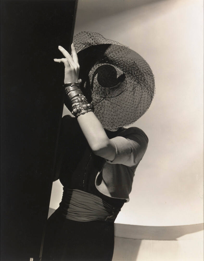 DescriptionImage of woman with head tilted down so that her veiled hat obscures her face. She's wearing a wide banded belt around her waist and a short sleeved sweater over her dress. Her left arm is raised across her body and is adorned with numerous bracelets.Gallery LabelPublished in Vogue magazine in January 1938, this black-and-white photograph by Horst P. Horst was accompanied by a vivid written description of the “infinitesimal yellow bolero,” “toast straw hat,” and “green jersey suède belt.” In the 1930s, color photography was time intensive and technically difficult to print. As a result, magazines often relied on descriptions of color when publishing black-and-white photographs. It wasn’t until decades later that improvements to film and printing technology simplified the process, bringing color fully into the pages of fashion magazines.