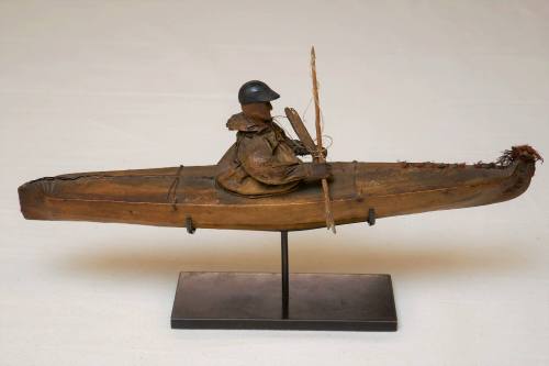DescriptionTiny model kayak fitted with a carved figure wearing a hat with visor and carrying an atlatl and spear.ProvenancePurchased from Mr. Earl Duncan, Stillwell, KS by The Nelson-Atkins Museum of Art, Kansas City, MO, 2018.