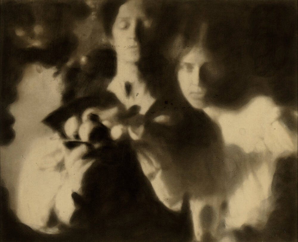 DescriptionSoftly-focused image of two feminine figures. The figure on the left stands with her eyes closed as she holds a tray (possibly filled with fruit) out in front of her. The figure on the right leans in beside the other figure and looks towards the viewer.ProvenanceThe Hall Family Foundation, Kansas City, MO, 2018;