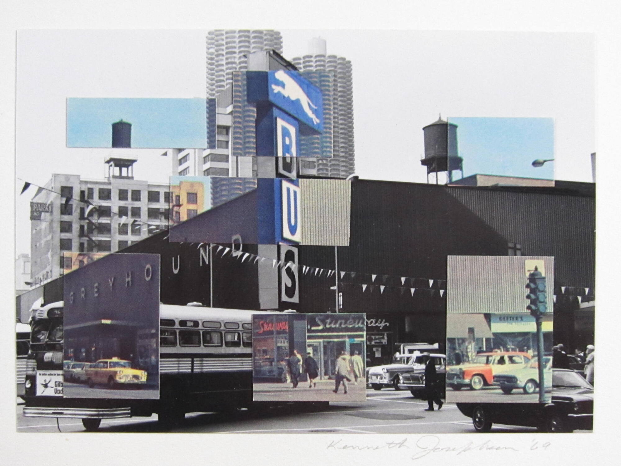 DescriptionBlack-and-white image of a busy street corner outside of a Greyhound bus station. Pedestrians cross the road as cars and busses wait near street lights. Pennant flag streamers are draped across the intersection. An offset lithograph of the same subject matter (in color) has been cut up and applied on top of the image in several locations.Provenance