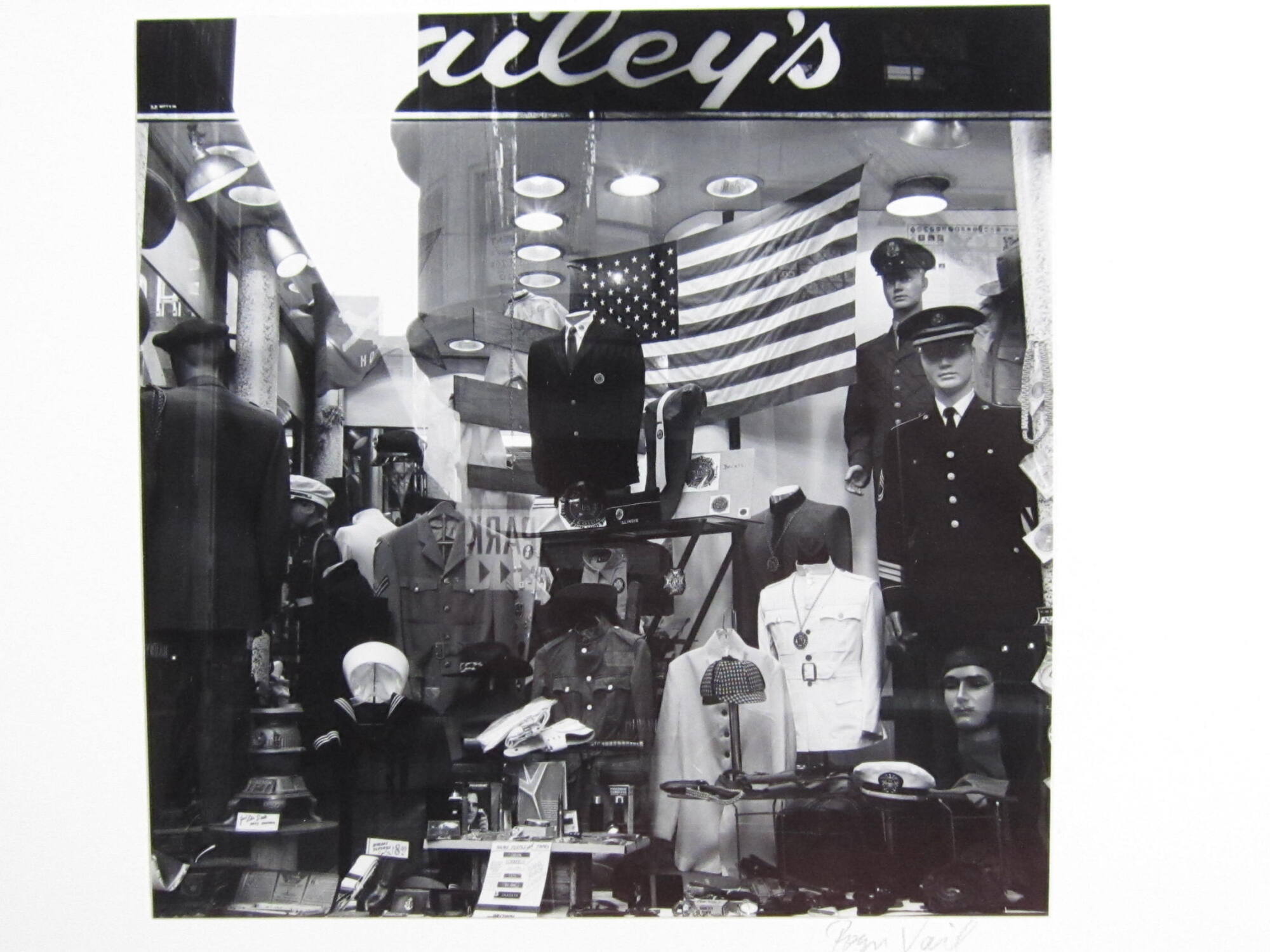 DescriptionImage of a merchandise display window with an American flag, men's uniforms, and accessories.Provenance