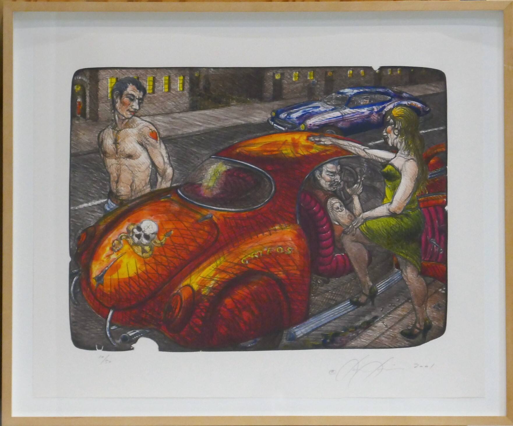 DescriptionThis image is a street scene depicting a man, seated in a red car, who is looking at a woman wearing a green dress who appears to have approached him. On the other side of the car, a second shirtless man with a tattoo of a heart on his arm passes by.ProvenanceWith the Lawrence Lithography Workshop, Kansas City, MO.