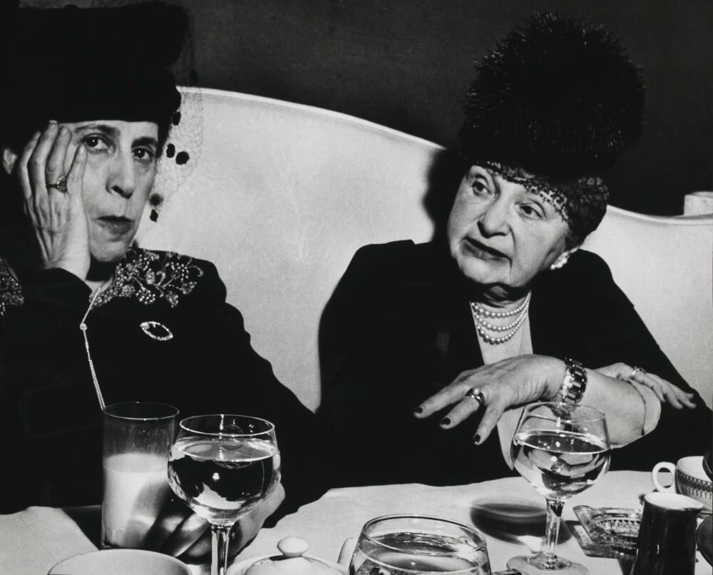 DescriptionImage of two women wearing ornate hats seated at a table with wine glasses. They are both wearing cocktail hats and pearl necklaces. The woman on the left looks toward the viewer with her right hand on her cheek.Gallery LabelLisette Model often photographed subjects in unguarded moments, stripping away elegance and laying bare the artifice associated with keeping up appearances. As photographer Edward Steichen once noted: “she strikes swift, hard and sharp…her work is devoid of all extraneous devices or exaggerations.” Model’s unsparing approach to her subjects had a strong influence on Diane Arbus, who studied with Model when she taught at the New School for Social Research from 1951 until her death.