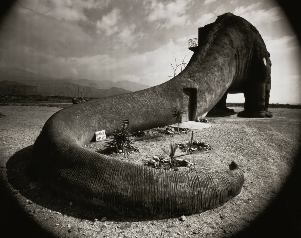 Dow photographed it from the rear at one such site in Cabazon, California, using a lens that created a round, vignetted border. This framing echoes the creature’s curled tail.