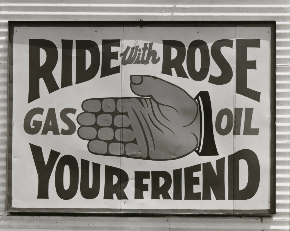 DescriptionImage of a painted sign with an outstretched hand; the sign reads "RIDE with ROSE / GAS OIL / YOUR FRIEND"ProvenanceThe Hall Family Foundation, Kansas City, MO, 2018;