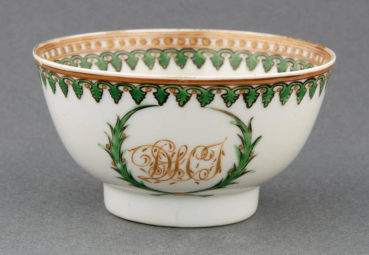 DescriptionCup without handle: white porcelain decorated with a band of enameled green and gold leaf designs on the inside and outside edges. On one side is a wreath encircling the initials DLCT. Saucer: white porcelain decorated with two bands of enameled green and gold leaf designs; in the center is a wreath encircling the initials DLCT.ProvenanceMargaret Cameron Chapman (née Mann, 1865-1935), Kansas City, MO, by 1935;