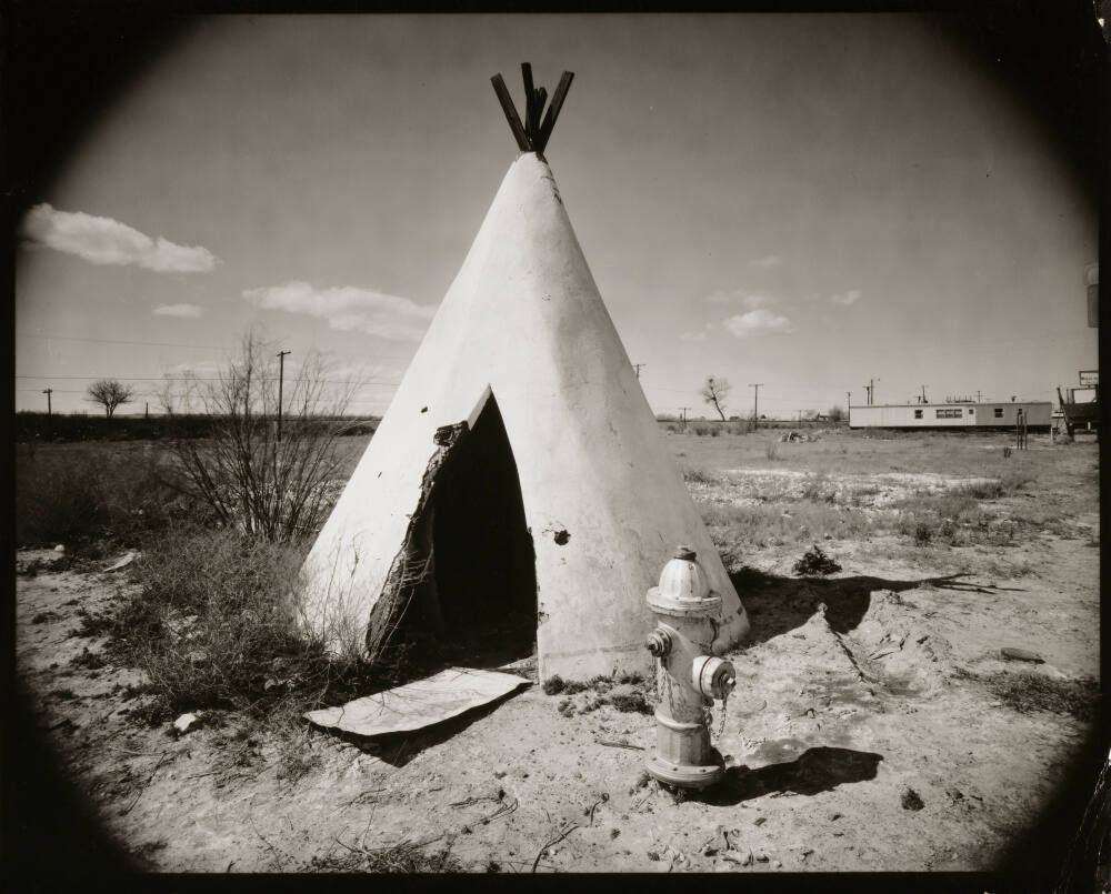 DescriptionImage (with darkened corners) of stucco teepee beside fire hydrant in middle of arid landscape with mobile home in background.Gallery LabelSome of Dow’s subjects are willful historical misconceptions. A stucco teepee, situated next to a fire hydrant in Canutillo, Texas, attempts to replicate a portable shelter used by Plains Indians. In reality, the object is an immobile bus shelter.