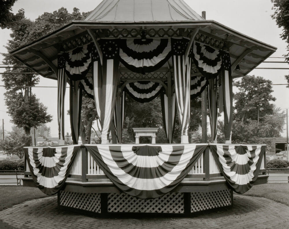DescriptionImage of a gazebo decorated with striped bunting flags and narrow flags with stars and stripes hanging from the columns.Gallery LabelDow once described everyday architecture and signage as “more alive, more intrinsically worthwhile than all the official architecture and historic spots.” Driving through upstate New York one Memorial Day, he saw this gazebo festooned with patriotic bunting. As he recalls: “American flags of all sizes and conditions were fluttering in front yards, on buildings and poles. Every town was chock-a-block full of them and this particular structure reminded me of a patriotic layer cake, maybe a little past its freshness.”
