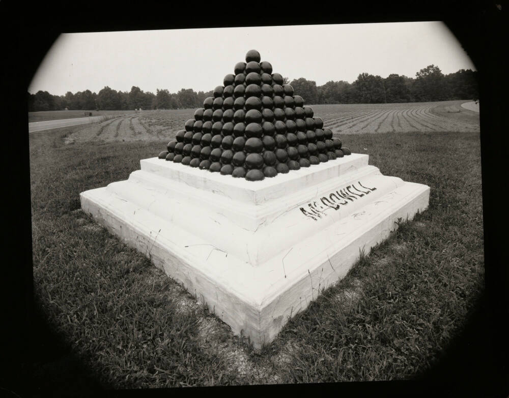 DescriptionImage of a tiered pedestal with cannonballs stacked in the form of a pyramid; the monument rests in a grassy field next to a road.Gallery LabelMonuments may also be understood as signs, meant to commemorate historic figures and events in public spaces. This cannonball monument marks the campsite of a Union commander during the Battle of Shiloh, an early conflict during the American Civil War and one of its deadliest battles. By including a strip of road to the left of the image and a cultivated field behind the monument, Dow presents the structure as part of the contemporary landscape. In so doing, he suggests that the present inevitably shapes our understanding of historic sites such as Shiloh, a former battlefield turned national military park.