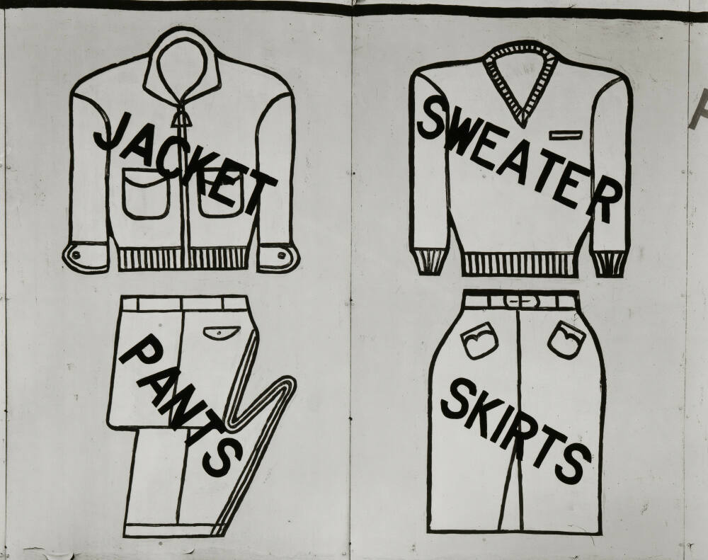 DescriptionImage of a laundry sign with outlined illustrations and accompanied text labels for a jacket, pants, sweater, and skirts.ProvenanceThe Hall Family Foundation, Kansas City, MO, 2018;