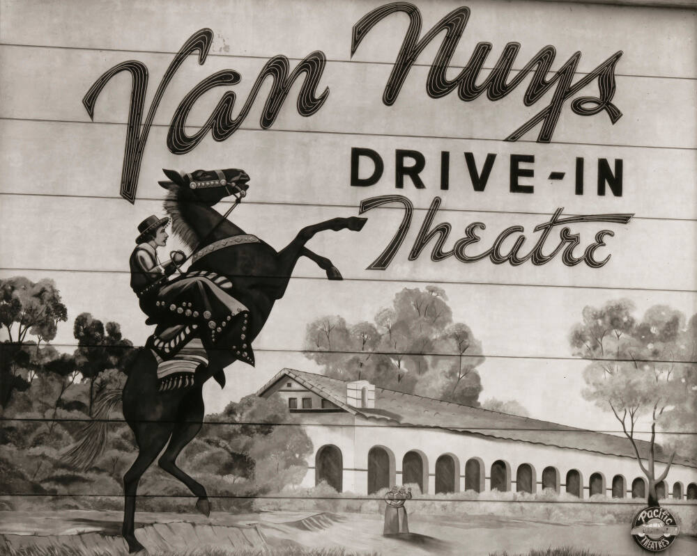 DescriptionImage of a sign for "Van Nuys Drive-In Theater". It depicts a man wearing a jacket, chaps, and a hat with pom poms lining the brim riding a bucking horse. In the background stand two women wearing long garments outside of a building with a row of arched openings.Gallery LabelThe Van Nuys Drive-In Theatre was one of several Pacific Theatre drive-ins featuring murals on their screens. This painting depicts a Californian vaquero (a Spanish-speaking