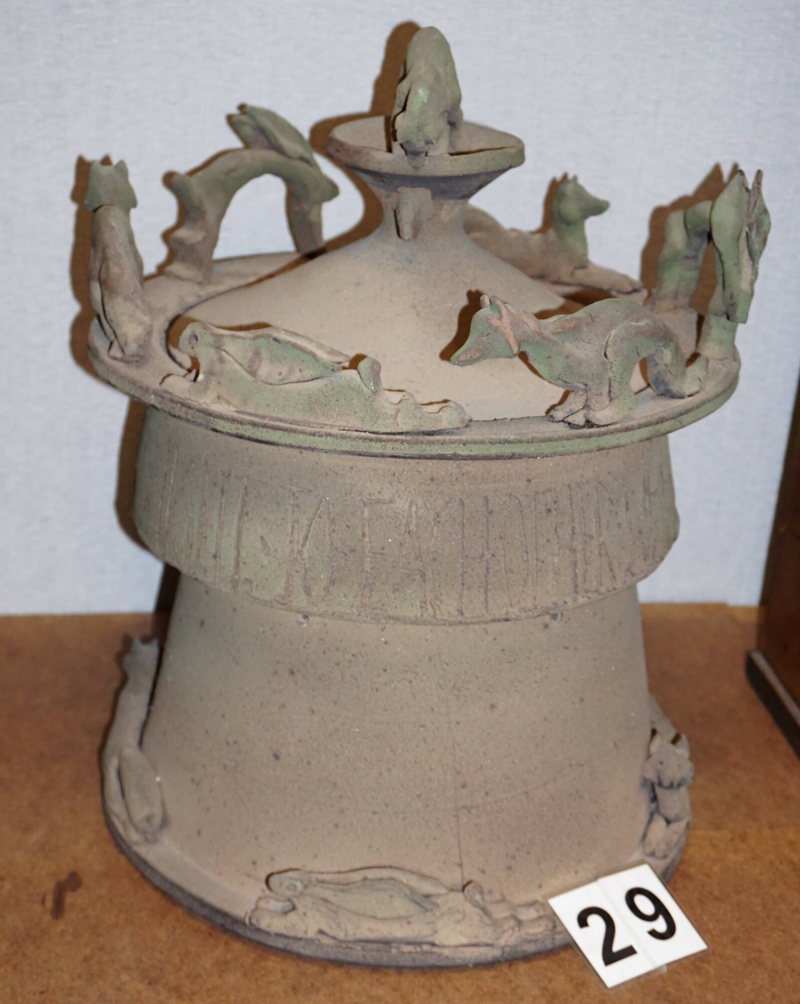 DescriptionA large, lidded vessel covered with a dark green glaze simulating patinated bronze. A single fox figure is perched atop a flared handle, leaning over to view a hare’s head. Hare and fox figures, articulated in pounce and arched stances circle the flared top edge, evocative of a chase. The text WHERE THE FOX AND THE HARE SAY GOODNIGHT TO EACH OTHER is engraved in thin block letters filling a thick band at the top of the form. Four foxes and hares in repose surround the bottom rim at the vessel's base.ProvenanceAmerican Century Investments, Kansas City, MO, 1994.
