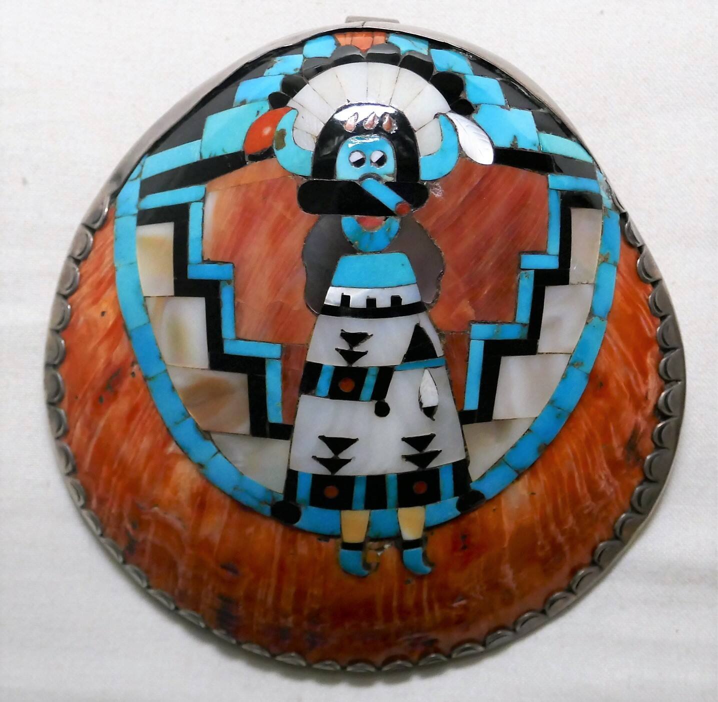 DescriptionInlaid pin/pendant with central figure of Shaliko, a sky being from Zuni mythology.Provenance