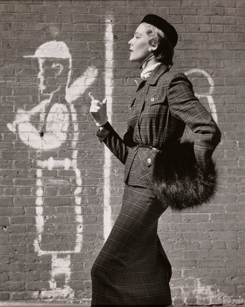 DescriptionImage of woman in profile walking by a brick wall with an outlined drawing of a baseball player. The woman is dressed in a long plaid skirt with matching belted jacket, fur muff, neck scarf, white gloves, and a small hat with a veil that covers her face.ProvenancePurchased from Howard Greenberg Gallery, New York, NY by the Hall Family Foundation, Kansas City, MO, 2018;