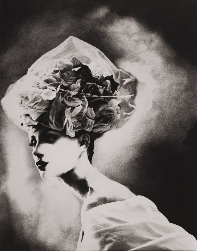 DescriptionSoftly focused image of a woman wearing an off-the-shoulder top and a hat of blooming flowers loosely wrapped in sheer fabric. She leans forward and looks off to the left. A white hazy glow surrounds her.ProvenanceHoward Greenberg Gallery, New York, NY;