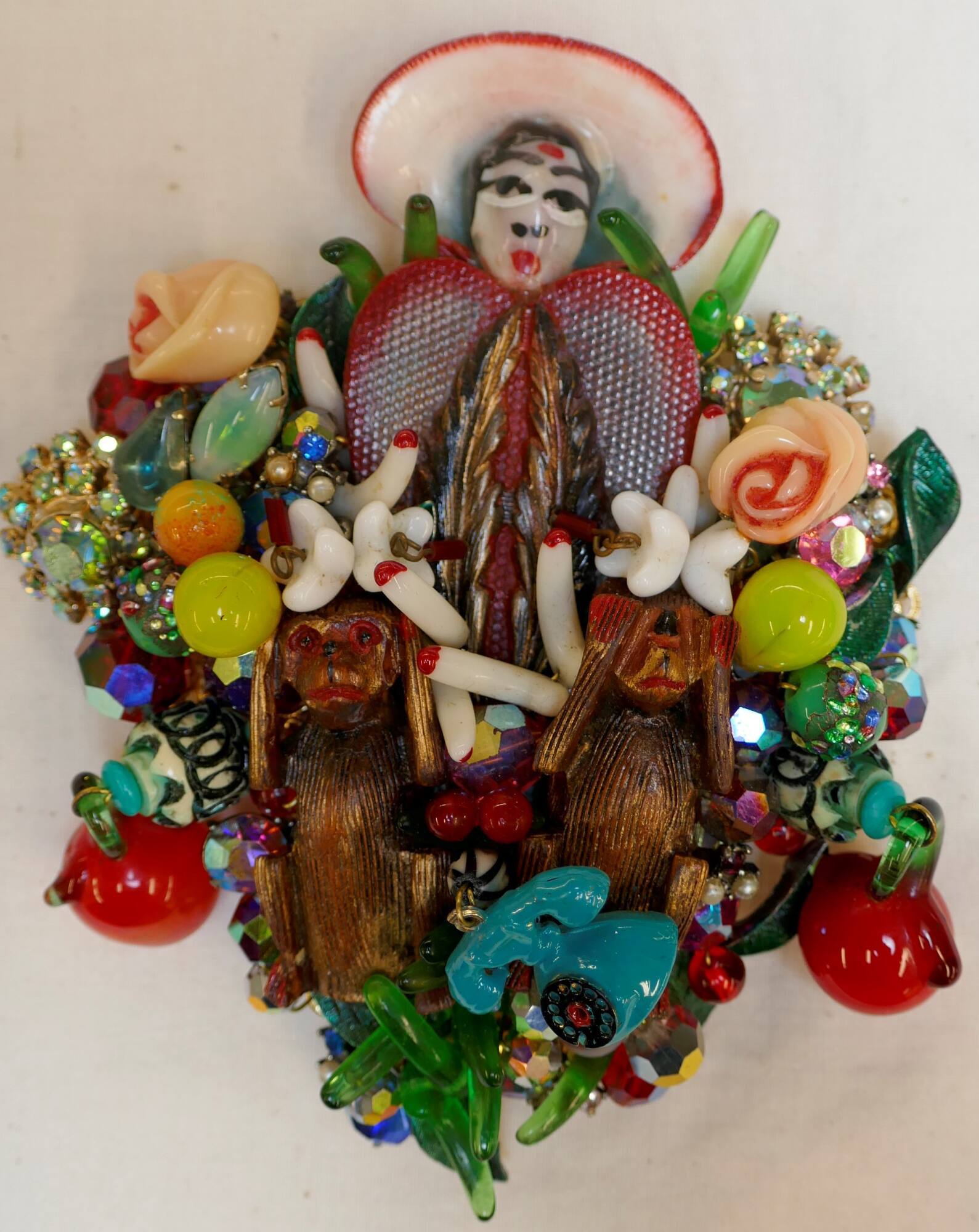 DescriptionA brooch made of a variety of found objects and materials including plastic and glass beads, costume jewerly, found objects, roses, glass cherries, and two monkeys: one covering its eyes, the other covering its ears. There is a central figure made from several beads. Evoking an angel, she has red wings, wears a hat and has facial features in black, white, and red paint. A single turquoise telephone is prominantly placed at the bottom of the brooch between the two monkeys.ProvenanceThe artist consigned to Helen Drutt, Philadelphia, PA by 2018;