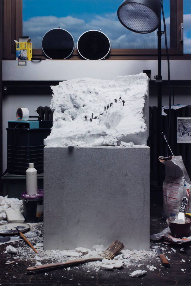 DescriptionImage of a miniature diorama depicting a group of mountaineers crossing a crevasse and ascending an ice-covered mountain.The diorama rests on a raised platform and is surrounded by "snow" debris, a spot light, and other materials (putty knife, paint brushes, plaster) used in its creation.Gallery LabelThe collaborative team of Cortis and Sonderegger recreate iconic photographs from history as three-dimensional models. Upon completion, they photograph their models to include the messy studio surroundings, including the tools and materials used to make them. Cortis and Sonderegger’s process calls attention to the staging of photographs, whether made in the studio or as a historic record. Here, they replicate an Alpine view originally made by the Bisson Frères (Bisson Brothers) in the early 1860s.