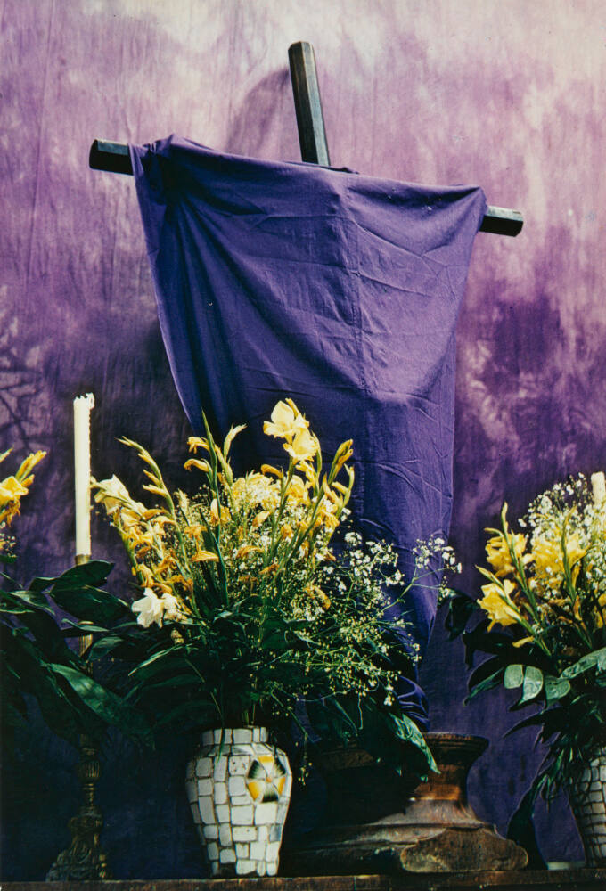 DescriptionImage of crucifix covered with a purple cloth; on the platform below are yellow flowers in mosaic vases.ProvenanceDr. Seth and Erin Neubardt, Rye, NY;