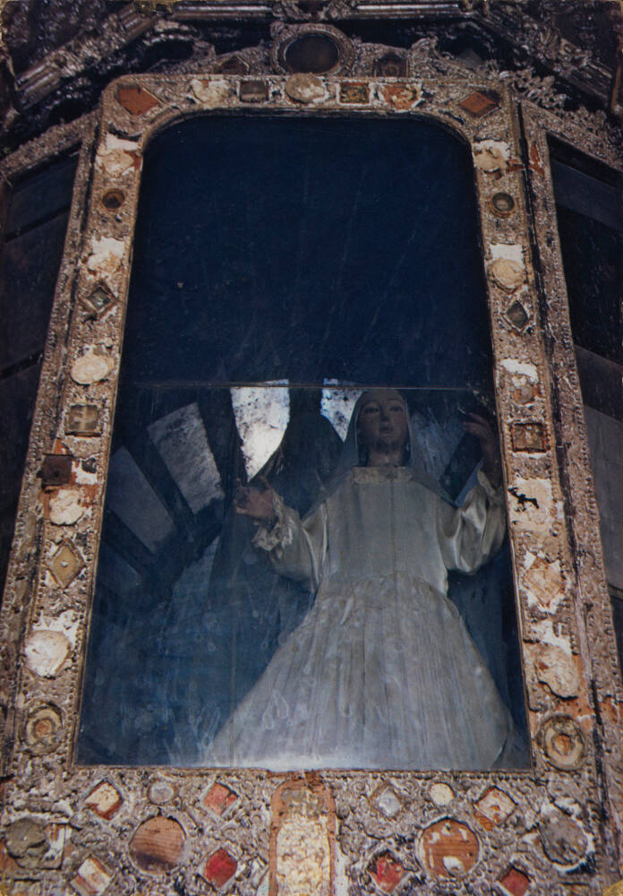 DescriptionImage of large mosaic frame with carved figure behind. The figure is dressed in a white gown and veil; her arms are raised.ProvenanceDr. Seth and Erin Neubardt, Rye, NY;