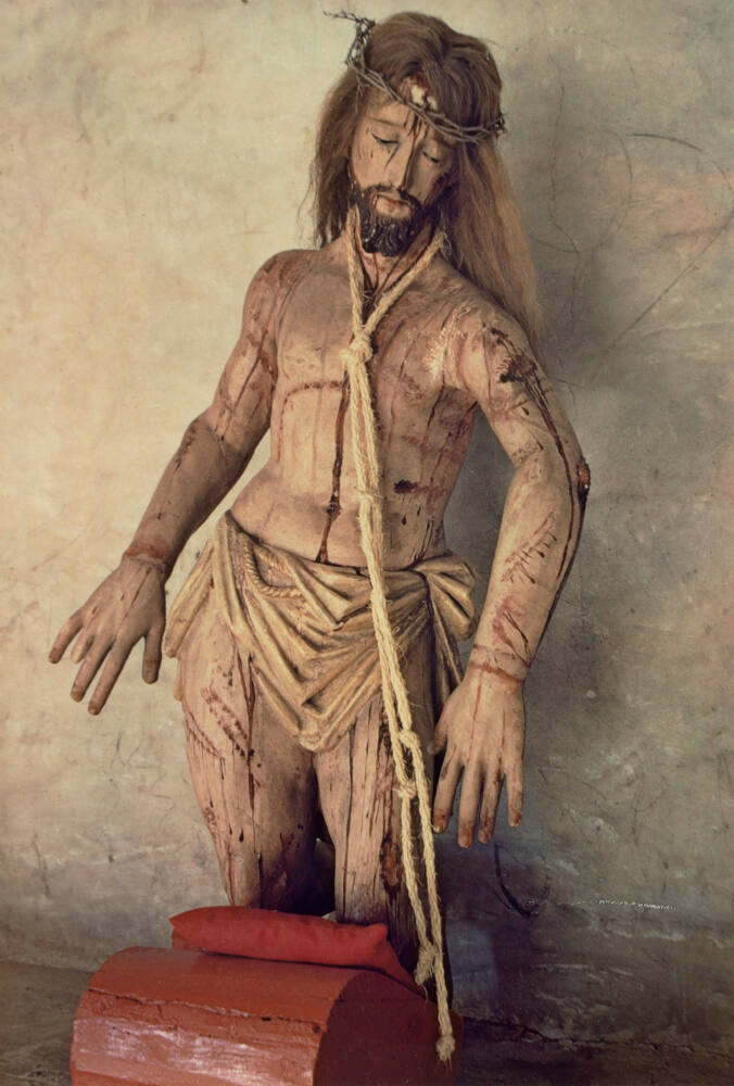 DescriptionImage of a carved Christ figure with real hair, a crown of thorns, and a rope around his neck. Streaks of blood cover his body.ProvenanceDr. Seth and Erin Neubardt, Rye, NY;