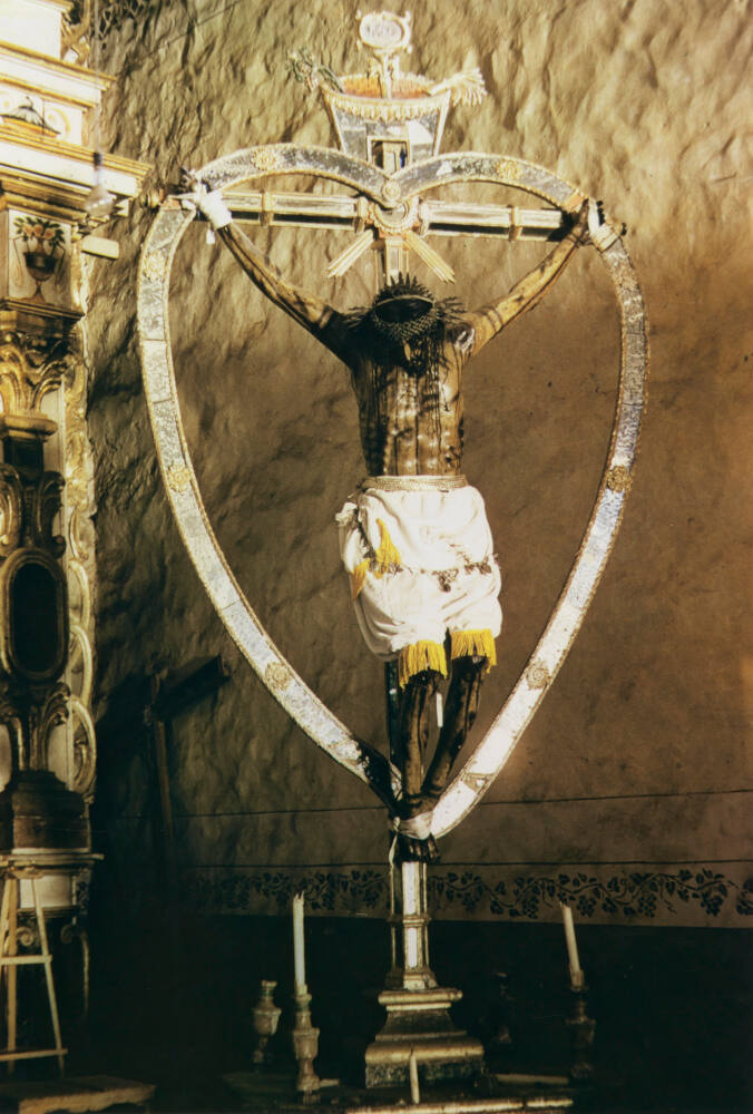 DescriptionImage of a crucifix on a gold and silver pedestal with a large heart surrounding. Tapered white candlesticks are on the platform below.ProvenanceDr. Jack and Judy Stern, Rye, NY;
