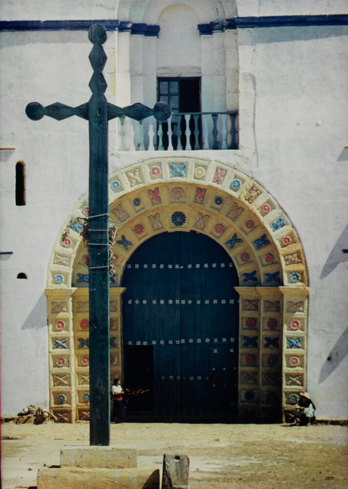 DescriptionImage of white facade with massive arched doorway surrounded by decorative tiles along the perimeter. A figure stands near the open door lower left and there is a blue wooden cross in the foreground.ProvenanceDr. Jack and Judy Stern, Rye, NY;