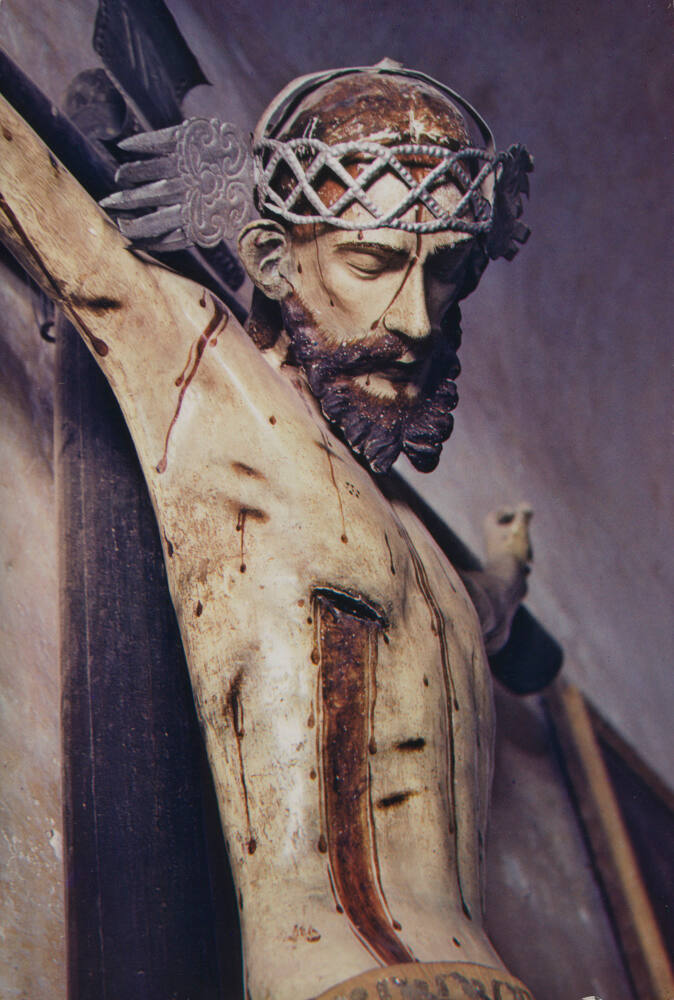 DescriptionDetailed image of crucified Christ figure carved from wood and painted. He wears a silver crown, his eyes are closed, and blood drips down his forehead and over his torso.ProvenanceDr. Jack and Judy Stern, Rye, NY;