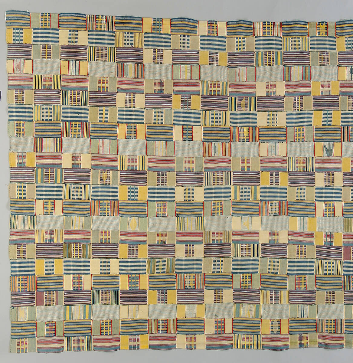 DescriptionThe textile consists of 22 strips of cloth sewn together. Each strip is composed of multicolored stripes which have been overlayed with "weft float" decoration that includes the representation of objects, animals, and humans.ProvenanceWith Mohr Textile Arts, New York, by May 1996;