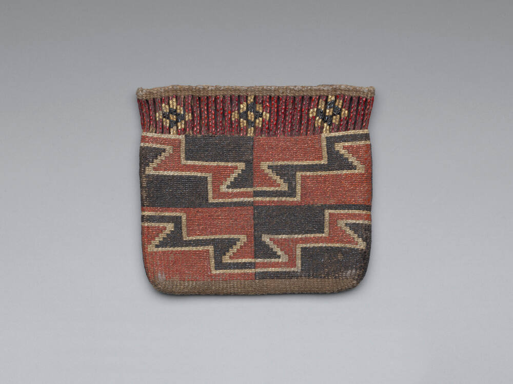 DescriptionA small bag with abstract, geometric designs mirrored on the front and back surfaces.ProvenancePurchased from Donald Ellis by Donald Ellis and Estelle and Morton Sosland, 2018.