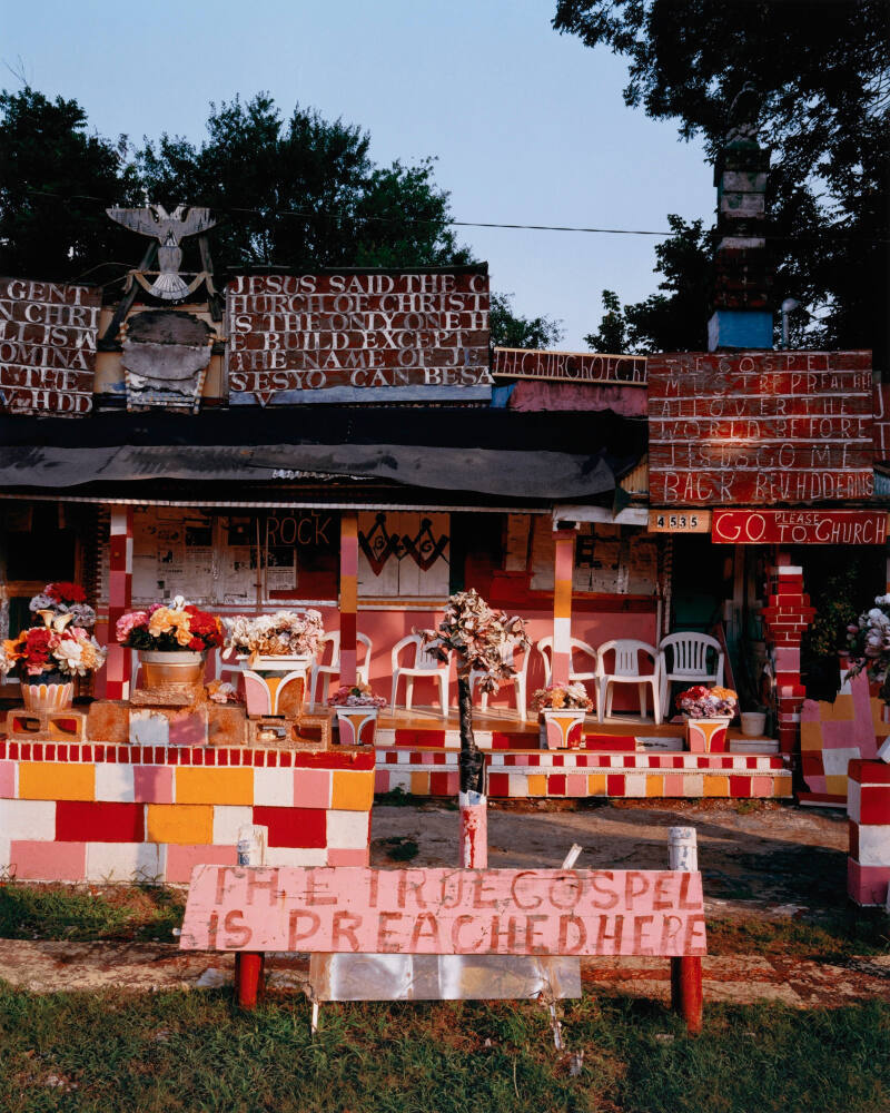 DescriptionImage of a building painted yellow, pink and white with a hand-painted sign in the front yard that reads "The True Gospel is Preached Here". White plastic chairs and artificial potted flowers line the porch.Gallery LabelThis bright, chock-a-block display of biblical texts and exhortations is the creation of Reverend H.D. and Margaret Dennis of Vicksburg, Mississippi. The elderly couple transformed Margaret’s former grocery store into a non-denominational church and a site for the couple’s self-taught artistic expression. Fascinated by the colorful and creative forms, photographer Bruce West took a series of photographs, titling his works after one sign that promised: “The True Gospel Preached Here.”