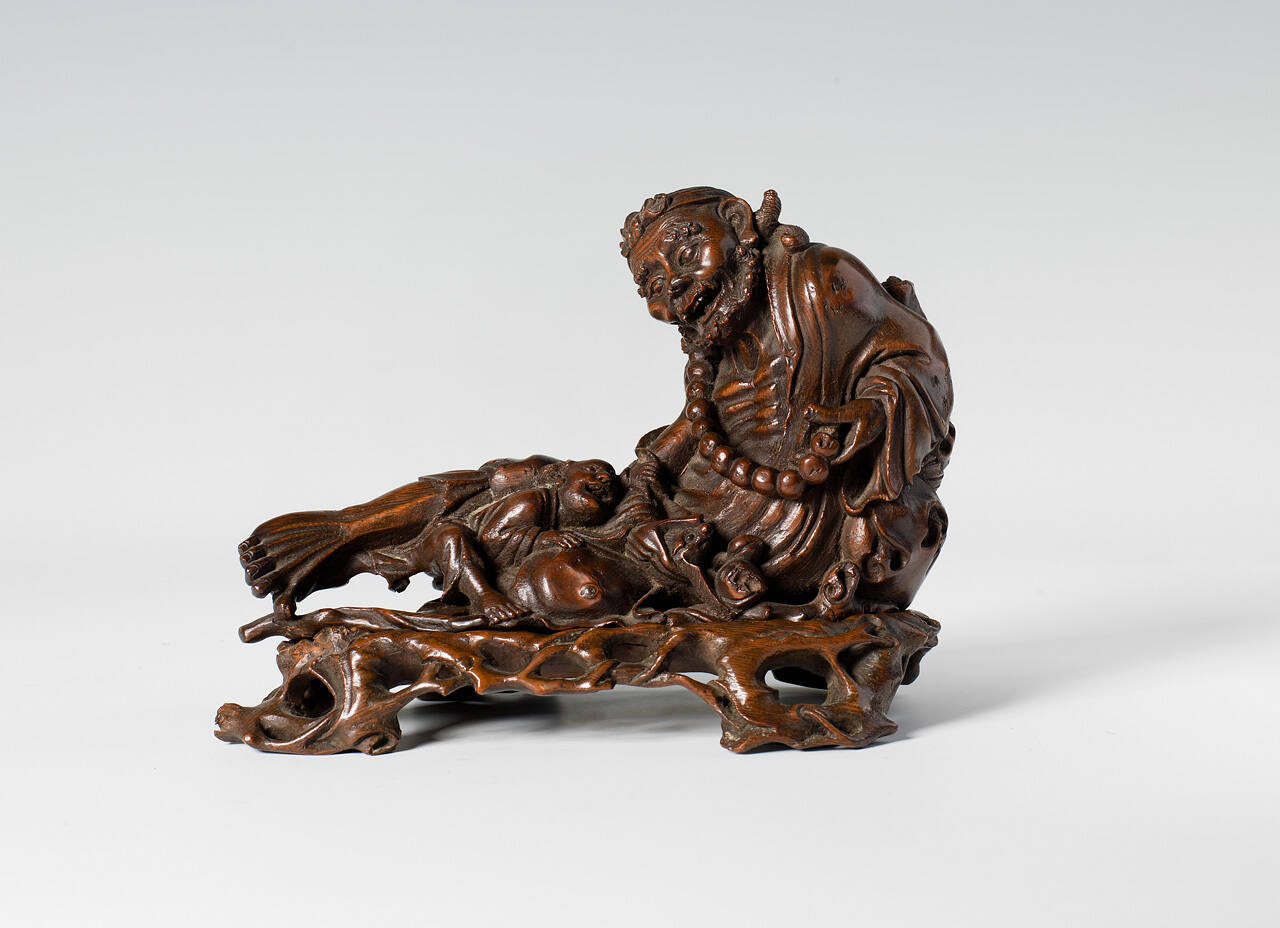 Gallery LabelThe Daoist immortals are known for their spiritual ability to transcend the physical world and have become popular in Chinese culture as powerful symbols of longevity. Li Tieguai (Iron Clutch Li), one of the most popular immortals, is worshiped as a divine saint for helping the sick and unfortunate. Legend says that Li adopted the corpse of a beggar for his body when his handsome earthly body was accidentally cremated while his soul was on an out-of-body journey. That story inspired many artists to create grotesque images of him, such as that seen in this sculpture.