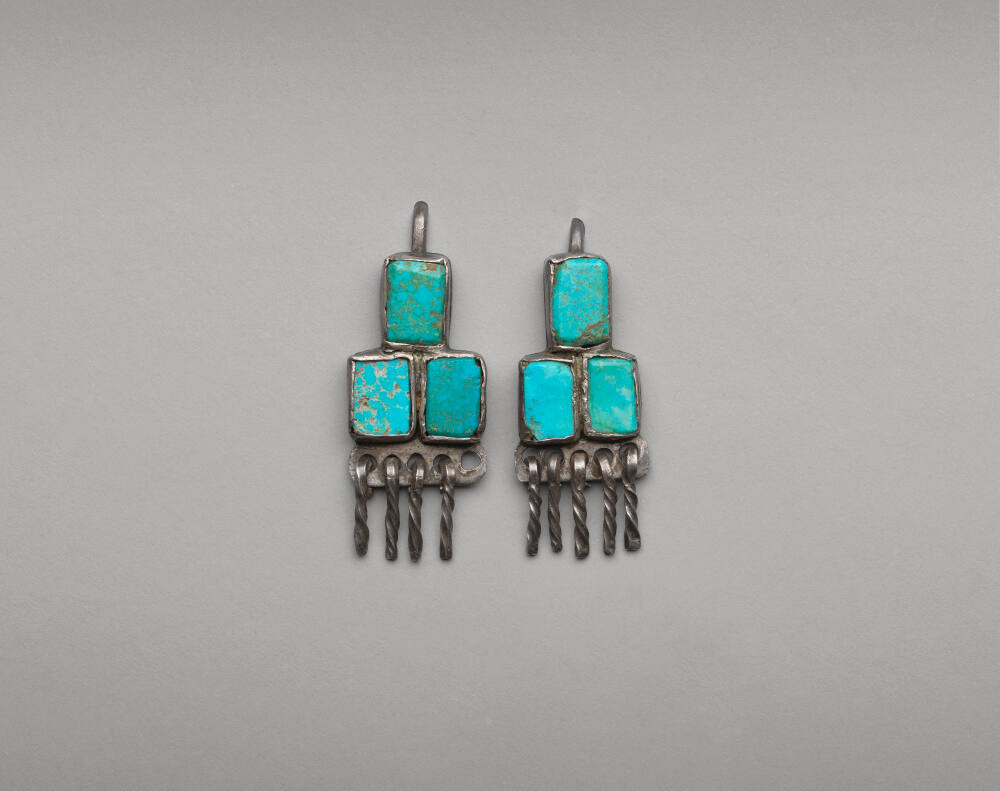 DescriptionA pair of silver and turquoise earrings representing clouds and falling rain below.ProvenancePurchased from an unnamed Laguna blacksmith, Paraje, New Mexico by Tony Garcia;