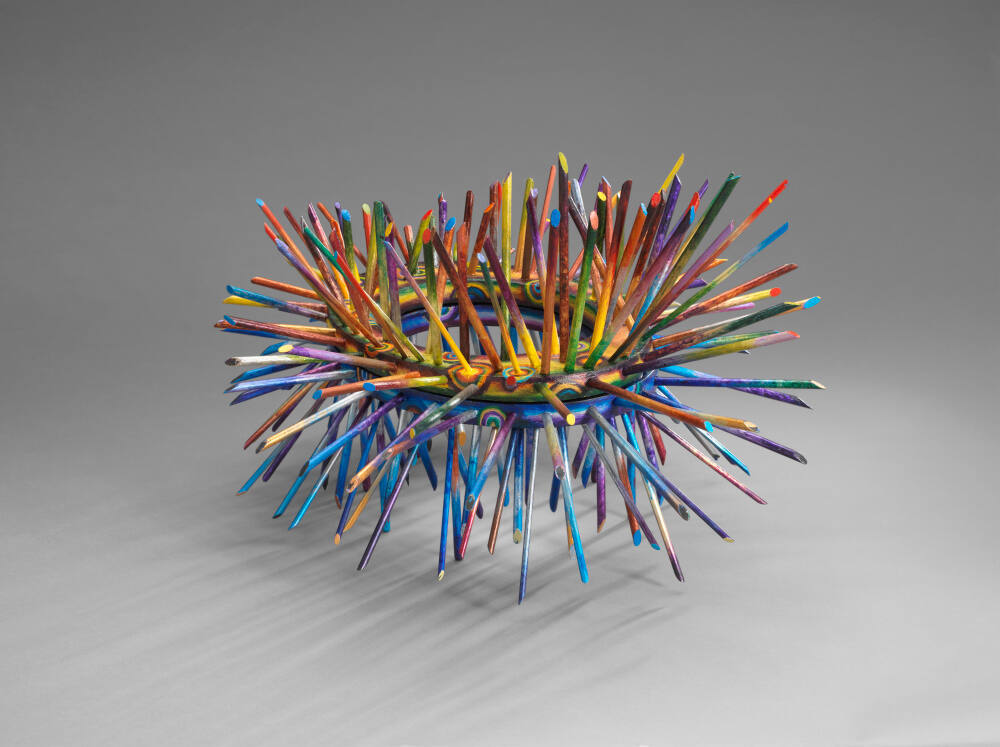 DescriptionTwo oversized crowns made of a flat oval plane of wood with numerous dowel rods jutting out all over the top surfaces. The dowels are taller at the front of the crowns and shorter at the back. Both are painted on all sides in a variety of colors. The top crown is painted in primarily warm colors, evocative of day, white the bottom is painted in primarily cool colors, evocative of the night. When stacked on one another they are able to free stand and are suggestive of a sea anemone.Provenance