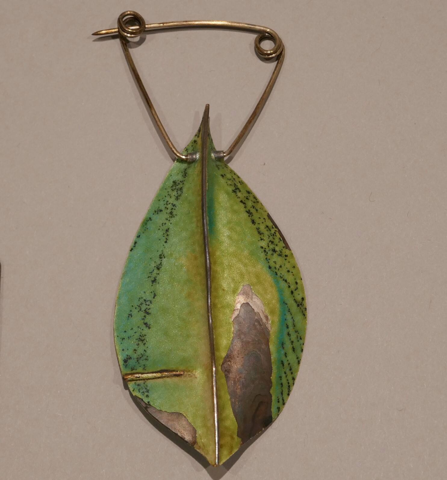 DescriptionA green enameled pin in the shape of an oblong leaf with a pinched central spine, hanging from fastener made of copper wire. A small fold is on the proper bottom right of the leaf.ProvenanceMarjorie Schick (1941 2017), Pittsburg, KS;