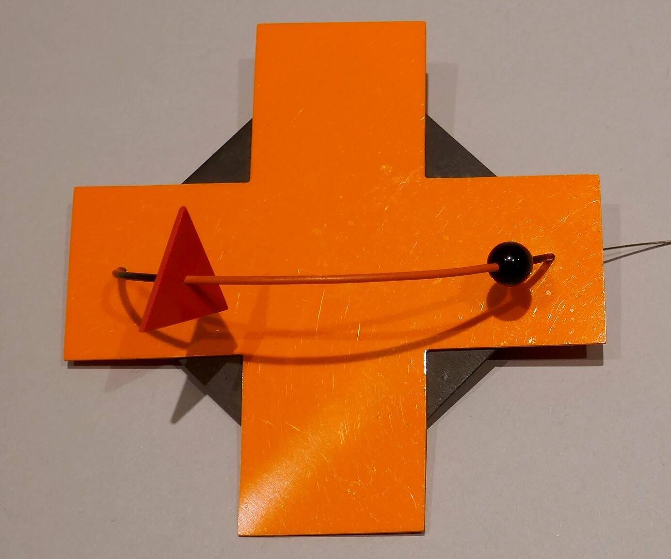 DescriptionA brooch composed of a black rhomboid beneath a large orange +. Attaching the two planes is a red tubular wire, with a rec equilateral triangle and a black sphere threaded on a curve.ProvenanceMarjorie Schick (1941 2017), Pittsburg, KS;