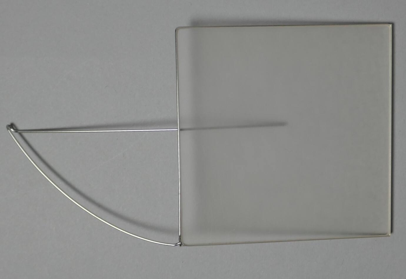 DescriptionA square piece of clear plastic with a silver wire wrapped around its edge. The silver wire extends from one corner of the square up and out in a curve, with a single stick returning to the center of the square as a fastener.ProvenanceMarjorie Schick (1941 2017), Pittsburg, KS;