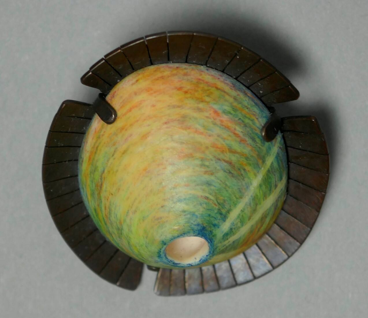 DescriptionA concave mound with a cavity just off-center. The mound is colored with a variety of colors possibly in crayon, creating a textured surface. The color mimics the void shape and starts with a blue outline, and green and yellow areas dominate most of the surface. The mount is inset in a metal disc with radiating sections, three of which are folded up to hold the mound in place.ProvenanceMarjorie Schick (1941 2017), Pittsburg, KS;