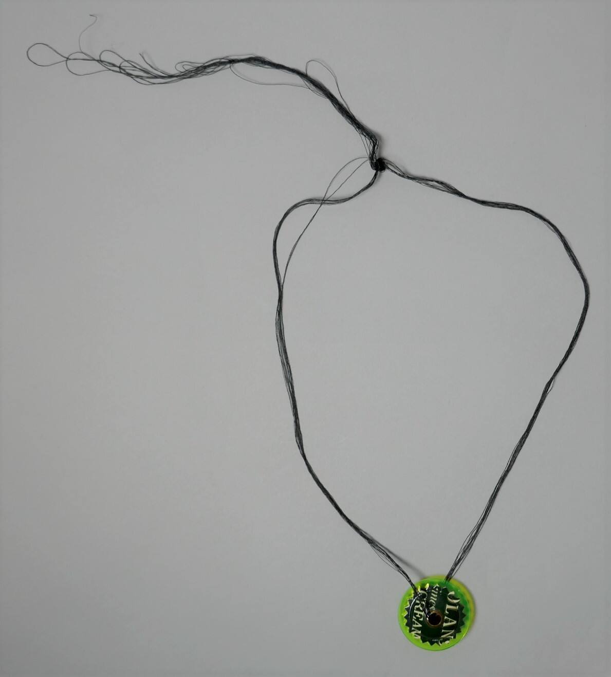 DescriptionA necklace made from multiple strands of thread and of a single round bead. The bead is made with recycle green metal encased in a neon yellow plastic ring. It reads OLANS Fines CREAM on one side, and has a black stripe with O N on the other side.ProvenanceMarjorie Schick (1941 2017), Pittsburg, KS;